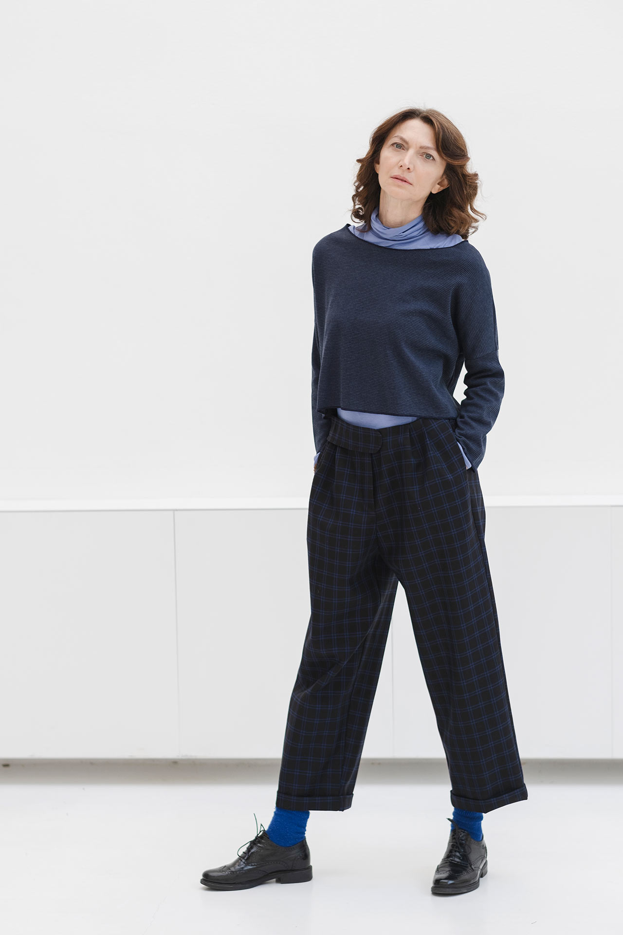 These straight-leg trousers were conceived to combine everyday comfort with the timeless elegance of tailored garments. Inspired by the clean and sophisticated lines of men’s wardrobes, these high-waisted trousers reinterpret classic proportions with a feminine and modern twist. The choice of a wide, straight leg, paired with a high waist and cuffed hem, is designed to subtly enhance the figure without excess. The side pockets and central pleat add functional and stylish details, making these trousers versatile and suitable for numerous combinations. Crafted from high-quality fabrics, they are perfect for any occasion, from work to casual outings or elegant events.