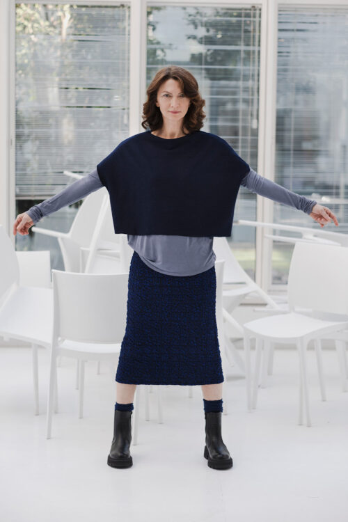 La maggior parte dei capi della collezione non ha bottoni e zip, per cui le taglie hanno ampia vestibilità!