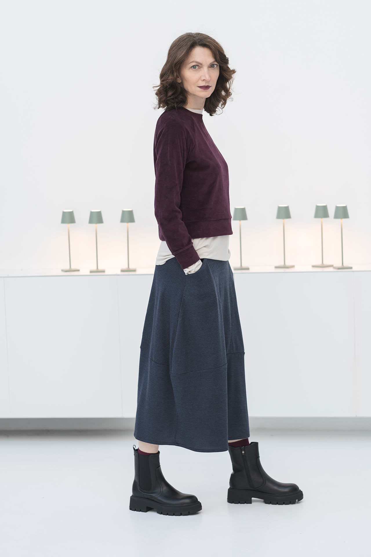 - Modello: gonna lunga caratterizzata da tre spicchi centrali