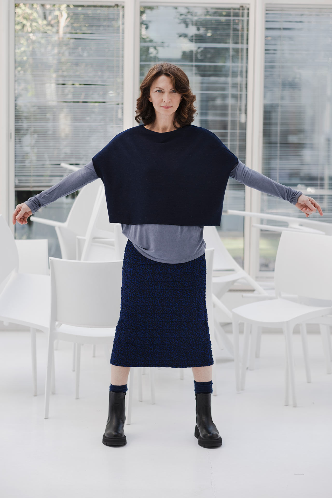 Questa maglia a scatoletta nasce dal desiderio di creare un capo facile da indossare ma con un tocco di raffinatezza. L’ispirazione deriva dalla forma del quadrato, con una base più lunga rispetto all’altezza, per dare fluidità e linearità alla silhouette. L’assenza di maniche richiama il gilet, aggiungendo versatilità ed eleganza. La scelta di un tessuto in lana risponde alla necessità di proporre un capo pratico ma di qualità, adatto a look sia casual che formali.