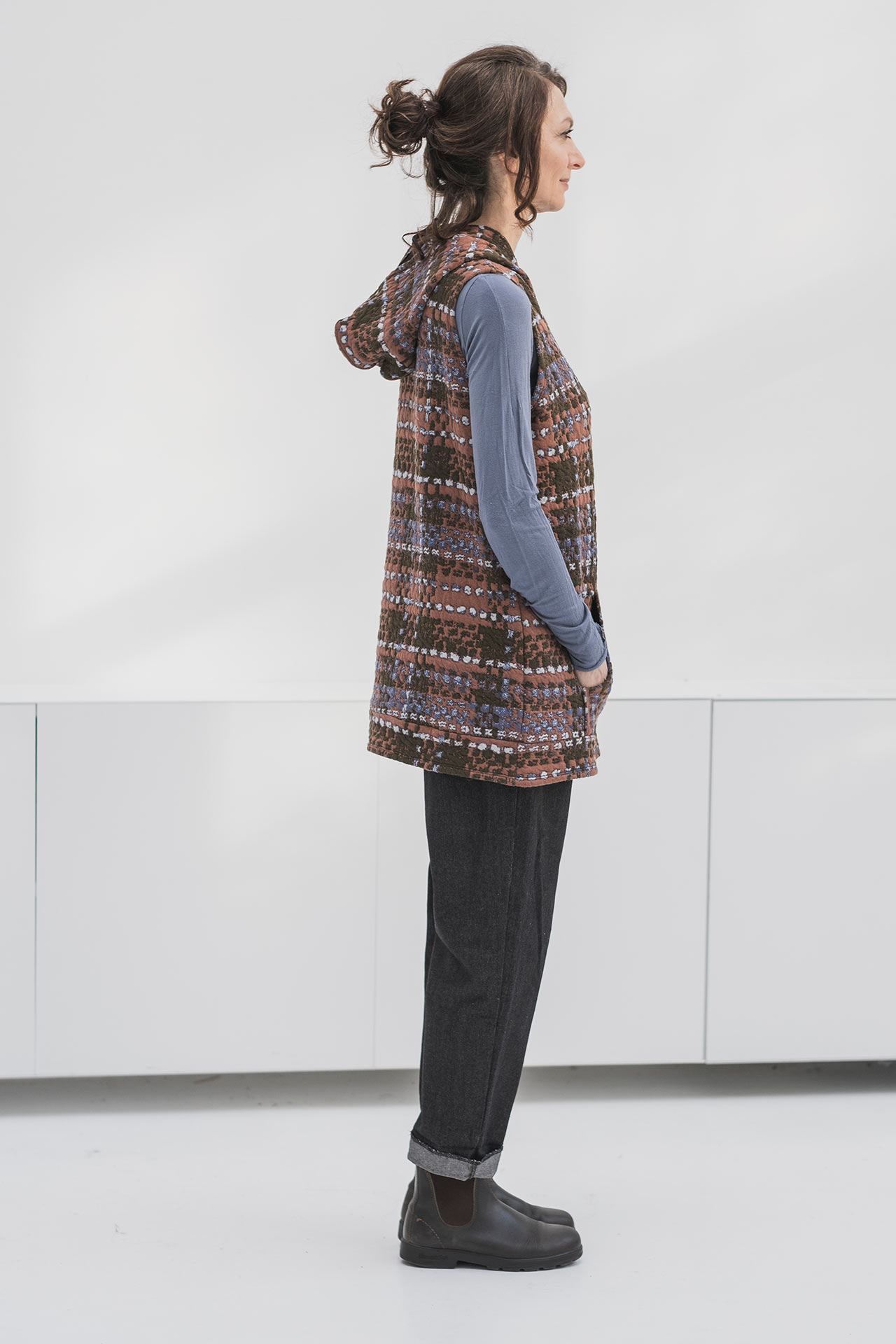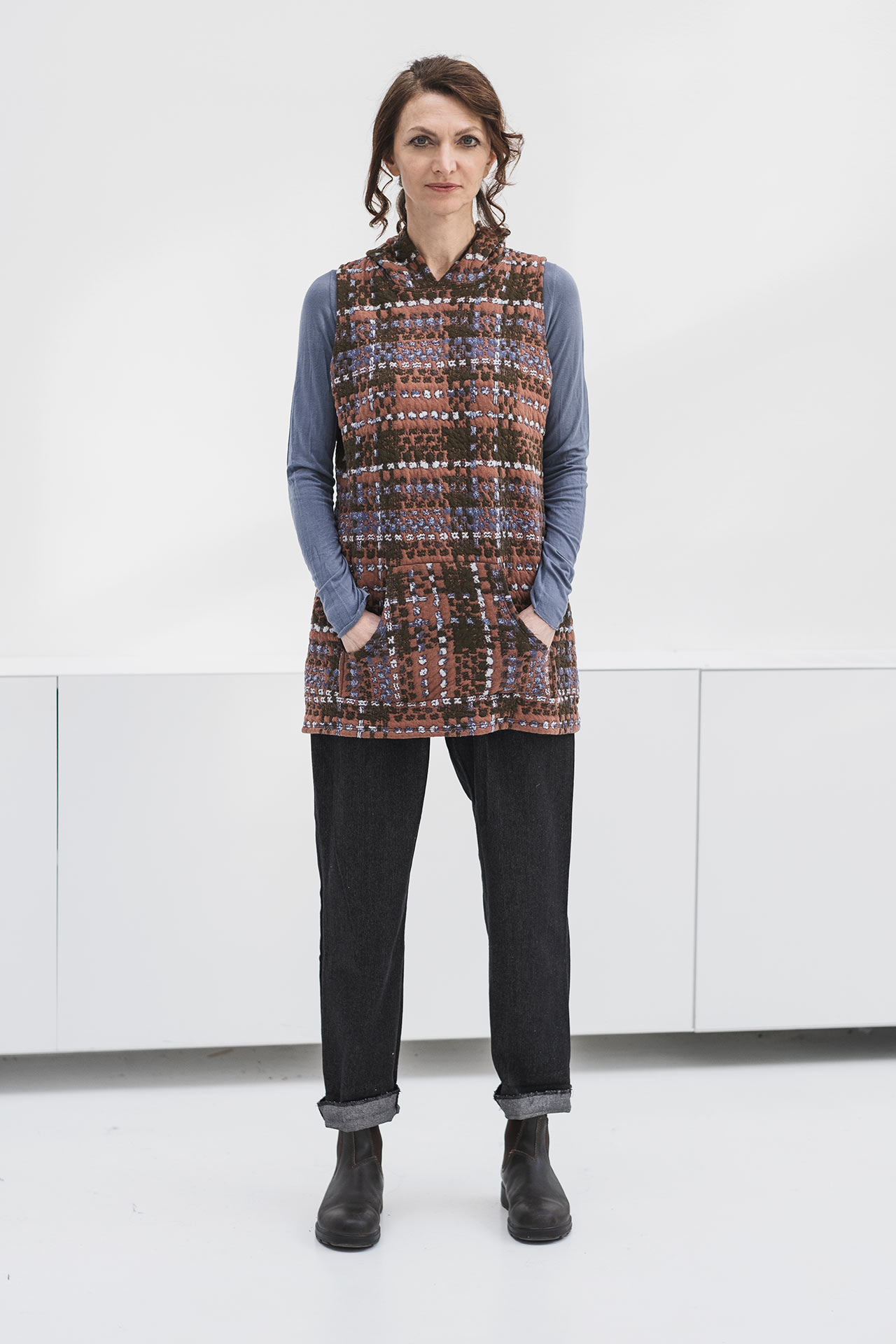 L’ispirazione per il Minidress deriva dall’idea di creare un capo versatile, adatto sia come gilet di mezza stagione sia come miniabito primaverile. Il design ampio e comodo, unito al tessuto goffrato, riflette il desiderio di un capo elegante ma pratico. L’ampia tasca marsupiale conferisce un tocco sbarazzino e funzionale, rendendo il minidress perfetto per uno stile casual e contemporaneo.