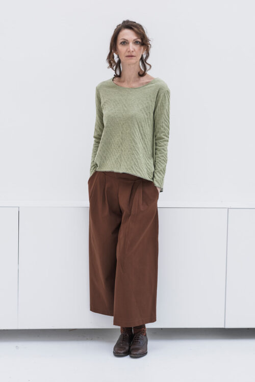 Il concetto di un pantalone con pince e taglio maschile è stato ispirato dai classici pantaloni maschili, reinterpretati però in una versione più femminile e versatile. La presenza dell'elastico in vita e delle tasche laterali nasce dalla volontà di creare un pantalone che fosse comodo per ogni occasione, che potesse essere facilmente indossato durante una giornata di smart working o per una passeggiata nel tempo libero. Il tessuto, scelto per la sua morbidezza e traspirabilità, è pensato per garantire il massimo comfort durante tutto il giorno. Il Pantalone Urban è, infatti, una sorta di "tuta elegante", che mantiene la praticità senza sacrificare lo stile. La sua realizzazione in lana o velluto a costine lo rende perfetto per essere indossato in ogni stagione, mantenendo un look sofisticato ma adatto alla vita di tutti i giorni.