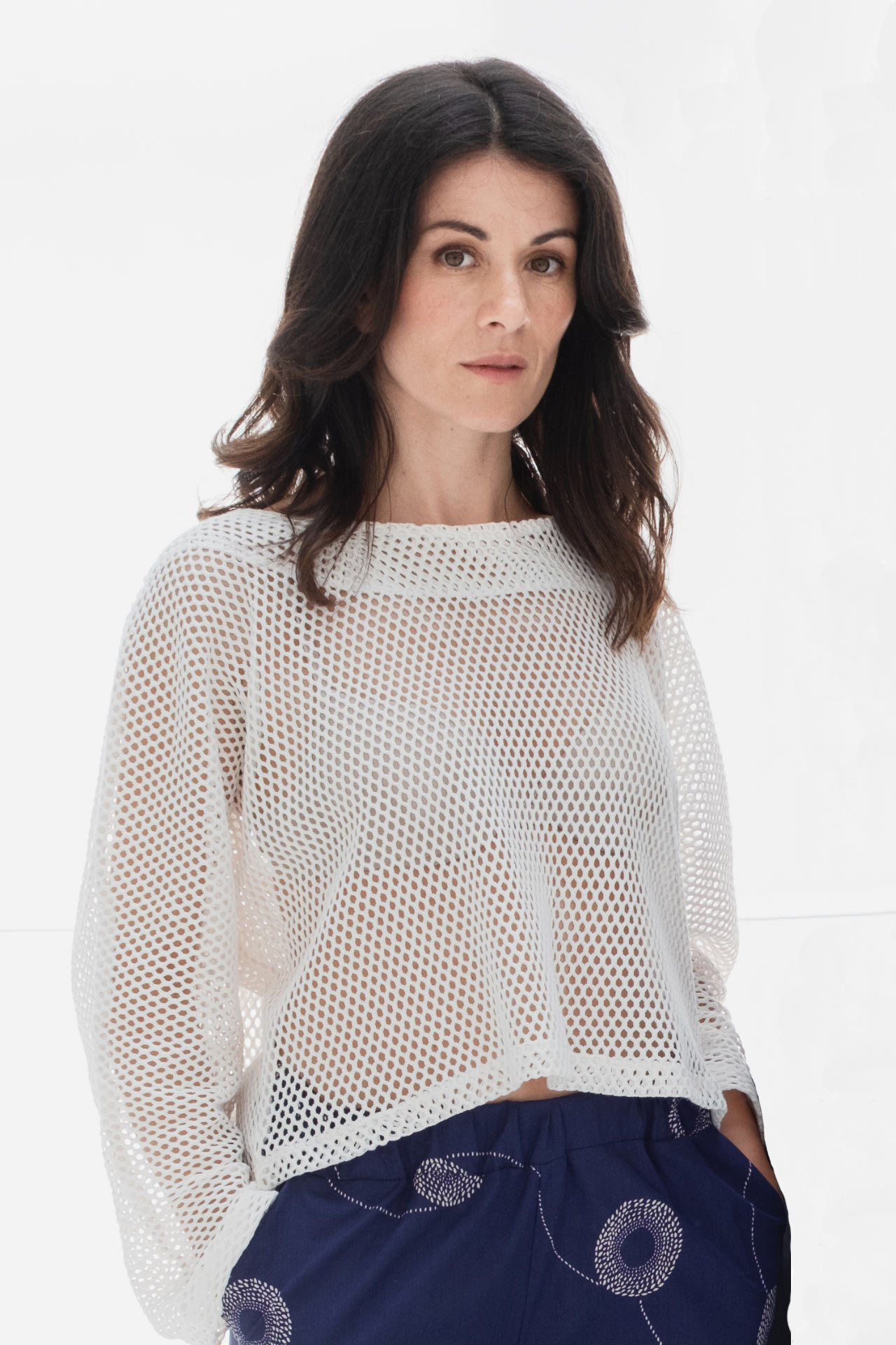 La Maglia Pippi è una maglia over che unisce comfort e stile. Questa maglia morbida presenta un scollo stondato che dona un tocco di raffinatezza e morbidezza al design. Le maniche scese e la forma svasata offrono una vestibilità ampia e comoda, mentre la lunghezza leggermente sopra i fianchi la rende perfetta per essere abbinata a jeans, pantaloni a vita alta o gonne. Con il suo taglio oversize, la Maglia Pippi è ideale per ogni occasione, dal look casual quotidiano a quello più sofisticato per la sera. Disponibile in cotone bianco effetto rete, questa maglia è un capo versatile che arricchirà il tuo guardaroba con classe e comfort.