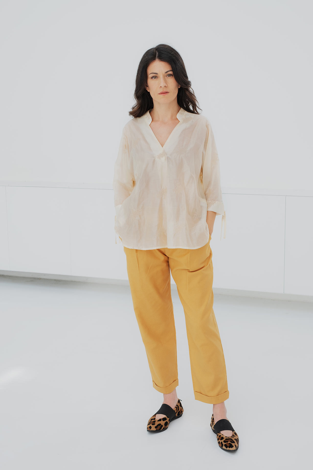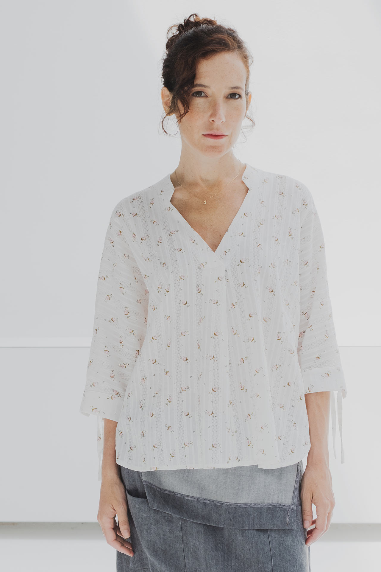 La Camicia Saudage in lyocell ricamato di Nicoletta Fasani è un capo d'abbigliamento che unisce eleganza e raffinatezza. Realizzata in due varianti: in cotone fantasia o in lyocell ricamato. Questa camicia offre un comfort eccezionale e una vestibilità impeccabile. Il suo scollo a V profondo valorizza la figura, mentre le maniche tre quarti con nastro di chiusura conferiscono un tocco di originalità e romanticismo. Un elemento distintivo di questa camicia è la sua versatilità: lo scollo a V crea un look sensuale ed elegante, e un effetto più sofisticato e inaspettato. Perfetta per essere indossata sia dentro i pantaloni che sopra una gonna, la camicia si presta a diverse occasioni, da eventi speciali a look sofisticati per il quotidiano.